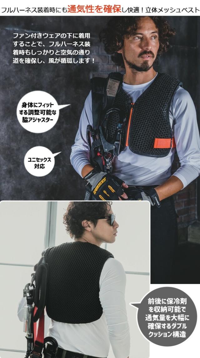 フルハーネス装着時に重宝するスペースを確保し空気の流れをキープする立体メッシュベストです。