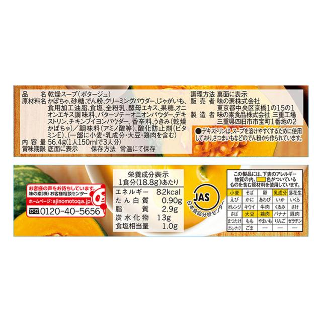 | かぼちゃ、砂糖、でん粉、クリーミングパウダー、じゃがいも、食用加工油脂、食塩、全粉乳、酵母エキス、果糖、オニオンエキス調味料、バーターソテーオニオンパウダー、デキストリン、チキンブイヨンパウダー、香辛料、うきみ(乾燥かぼちゃ)/調味料(アミノ酸等)、酸化防止剤(ビタミンE)、(一部に小麦・乳成分・大豆・鶏肉を含む) |