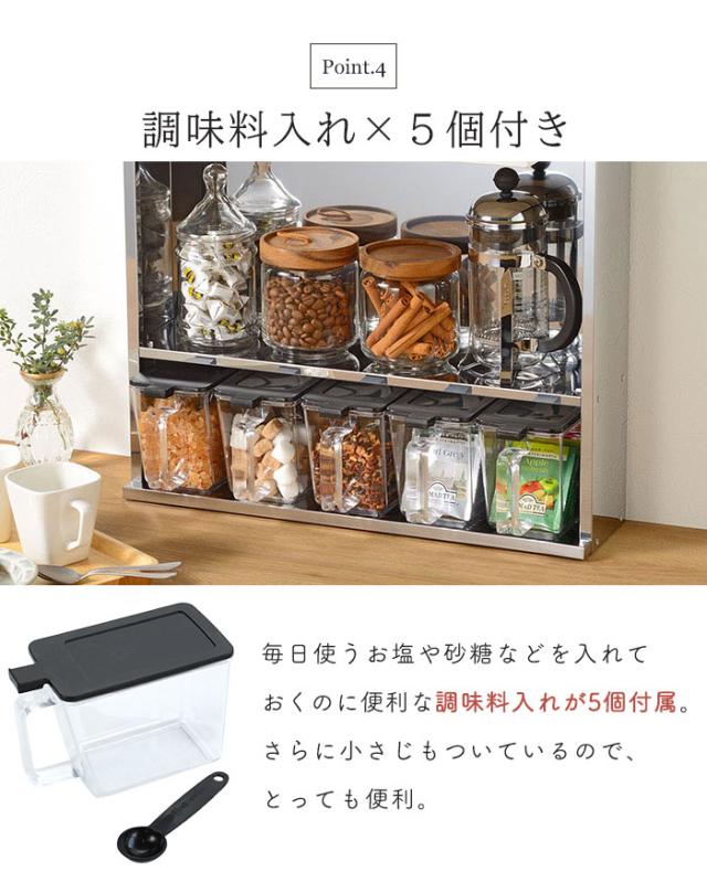 下段には付属の調味料ケースが5つ収まり、よく使う塩や砂糖のほか、ハーブやローリエの葉っぱ、余った小袋調味料などの片づけに最適。