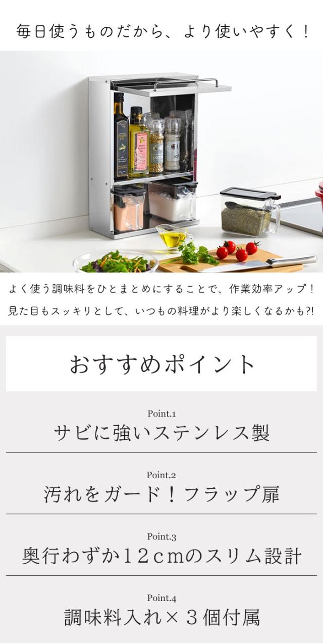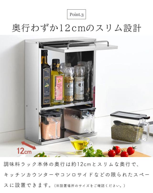 スパイスラック ステンレス 調味料ラック シルバー スパイスストッカー 2段 スリム 調味料ポット3個付き ステンレス製 日本製 キッチンラック 奥行12cm 省スペース キッチン上ラック スパイス収納 調味料 スパイス おしゃれ 新生活 一人暮らし