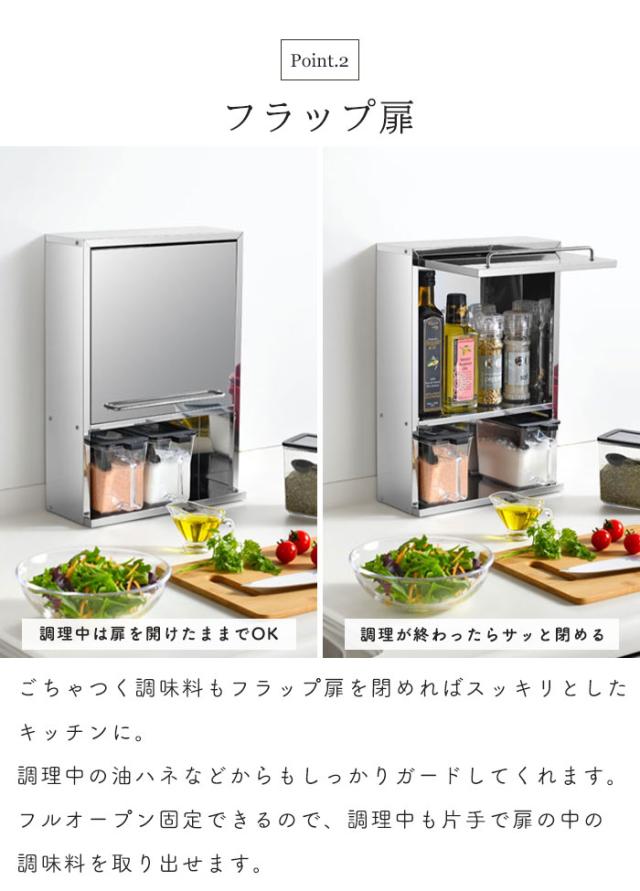 | ごちゃつく調味料を隠して収納! 調味料をひとまとめにして、キッチンをすっきり整理整頓できるスパイスストッカー。 高級感がありスタイリッシュなオールステンレス製。 水やサビ、熱に強く、汚れもサッふき取るだけでお手入れ簡単。 下段には付属の調味料ケースが3つ収まり、よく使う塩や砂糖のほか、ハーブやローリエの葉っぱ、余った小袋調味料などの片づけに最適。 上段の扉収納には、こまごまとした調味料を隠してすっきり収納でき、水はねや油汚れから調味料を守ります。 フラップタイプなので、開けたまま片手で出し入れも簡単。 扉内には500mlのボトルオイルや背の高い瓶類も入ります。 扉の裏側にローラーが取り付けてあるため、開閉がスムーズで、嫌な金属音もありません。 本体はマグネットがつく素材なので、キッチンタイマーやミニレシピの貼り付けもできて便利。 奥行12cmの省スペースタイプで場所を取らず作業スペースを広く確保できます。 |