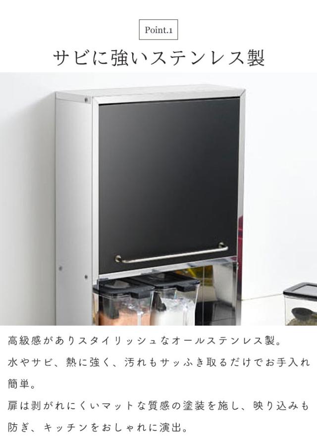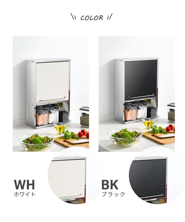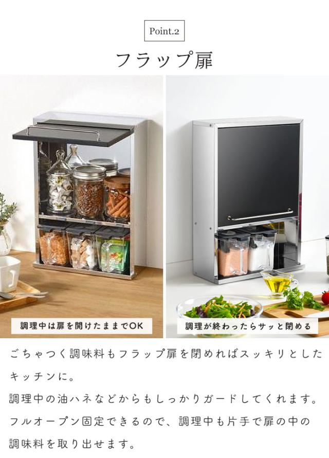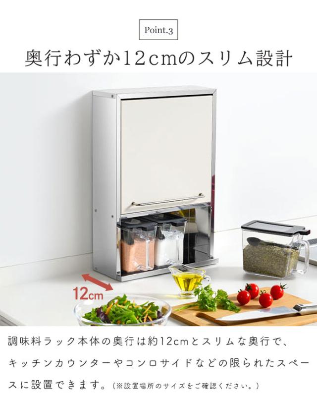 | ごちゃつく調味料を隠して収納! 調味料をひとまとめにして、キッチンをすっきり整理整頓できるスパイスストッカー。 下段には付属の調味料ケースが3つ収まり、よく使う塩や砂糖のほか、ハーブやローリエの葉っぱ、余った小袋調味料などの片づけに最適。 扉は剥がれにくいマットな質感の塗装を施し、映り込みも防ぎ、キッチンをおしゃれに演出。 上段の扉収納には、こまごまとした調味料を隠してすっきり収納でき、水はねや油汚れから調味料を守ります。 フラップタイプなので、開けたまま片手で出し入れも簡単。 扉内には500mlのボトルオイルや背の高い瓶類も入ります。 扉の裏側にローラーが取り付けてあるため、開閉がスムーズで、嫌な金属音もありません。 本体はマグネットがつく素材なので、キッチンタイマーやミニレシピの貼り付けもできて便利。 奥行12cmの省スペースタイプで場所を取らず作業スペースを広く確保できます。 |