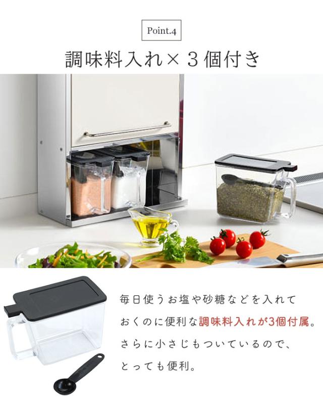 下段には付属の調味料ケースが3つ収まり、よく使う塩や砂糖のほか、ハーブやローリエの葉っぱ、余った小袋調味料などの片づけに最適。
