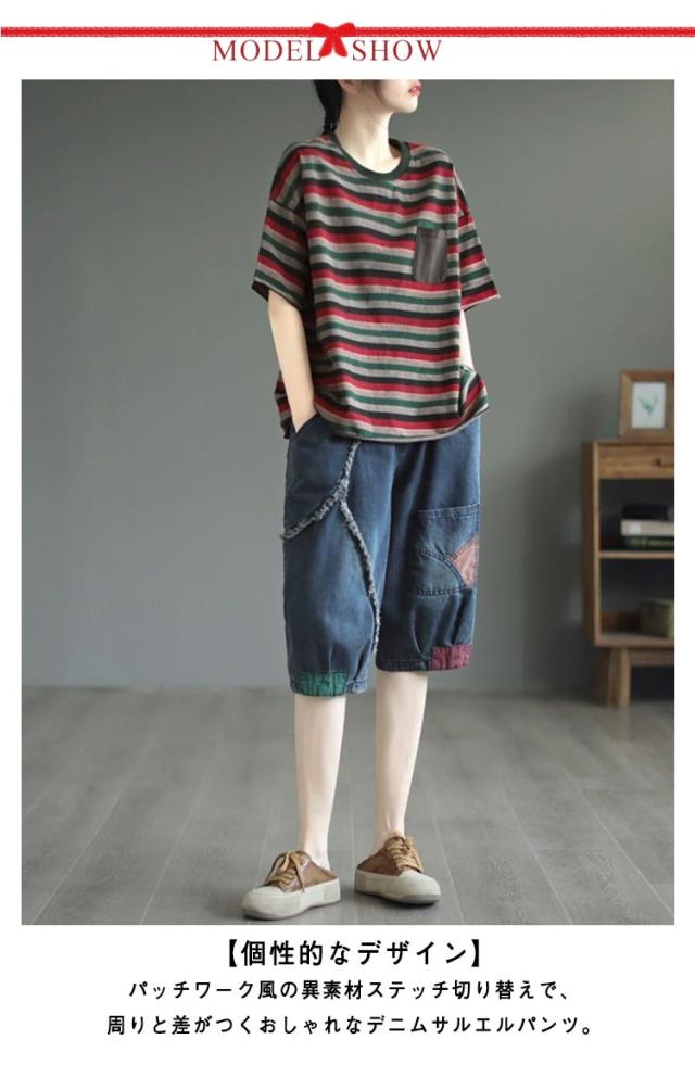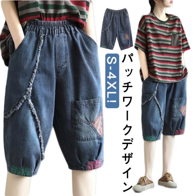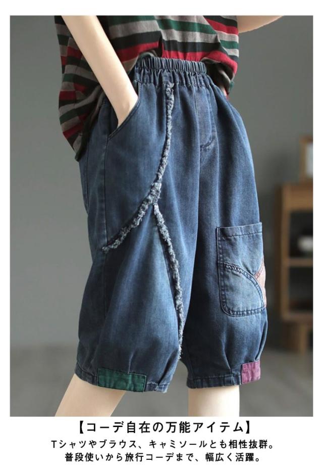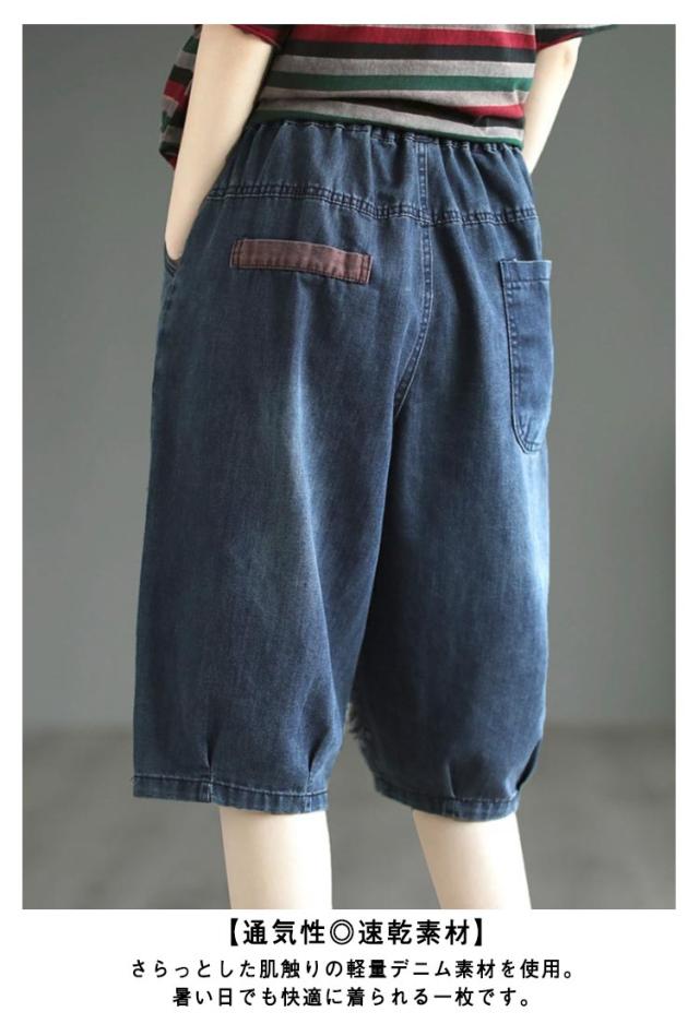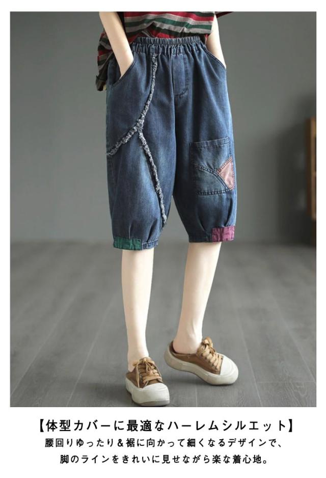 レディース デニムハーフパンツ 夏用 五分丈/六分丈 ハーレム風 デニムパンツ サルエルパンツ クロップド丈 ゆったり ジーンズ パンツ ウエストゴム 楽チン 送料無料
