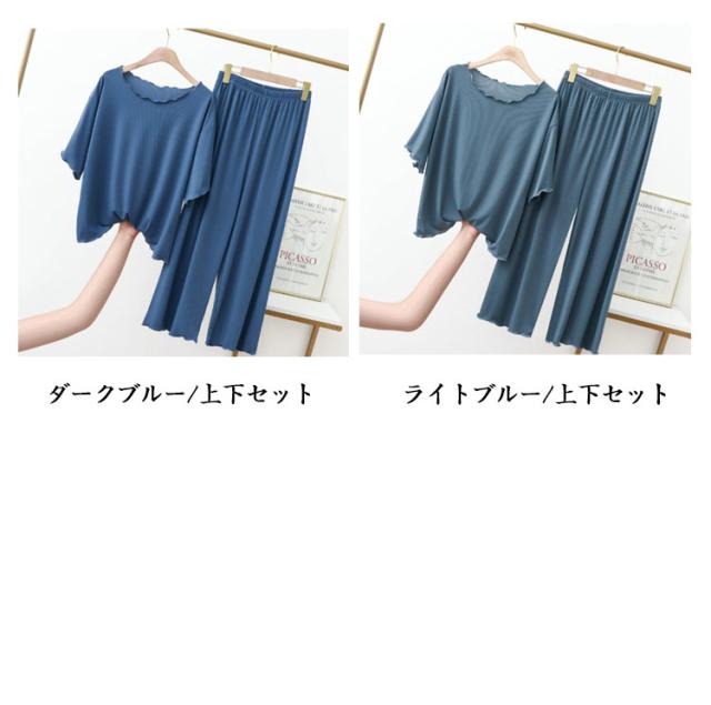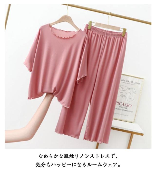 | おうち時間も可愛く♪着心地抜群なルームウェア 半袖トップス+7分袖パンツ、夏を涼しく快適に過ごせる♪ なめらかな肌触りノンストレスで、気分もハッピーになるルームウェア。 伸縮性に優れた柔らかい生地。 ボトムのウエストはゴム仕様でストレスフリー! | |