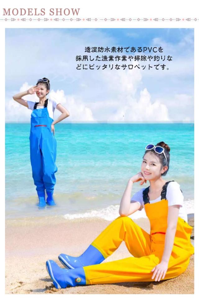 | 23cm〜25cm!海に川に湖に!釣りをするなら必須アイテム!便利なポケット付き。 透湿防水素材であるPVCを採用した漁業作業や掃除や釣りなどにピッタリなサロペットです。 溶着強度に優れた生地は大変丈夫なため、耐寒性・耐摩擦性・耐剥離性を備え、厳しい作業環境に耐えることができます。 PVC加工で防水性・撥水性の高い生地が使われており、水に濡れないのはもちろんですが、水温で奪われる体温の低下スピードを遅くします。 足から胸までを覆う部分に防水性・撥水性の高い生地が使われており、履くだけで体が濡れるのをしっかり防ぐことができます。 ブーツとズボンは縫い合わせるのではなく、一体化でつくられており、水漏れはしません。通気性もよいこの胴長ウェーダーをはき、渓流に入っても体を乾燥的に保ちます。 防滑ソールを採用しており、バス釣りや防波堤には最適です。靴裏は厚底になっており踏みつけ怪我の防止になります。 様々な場所で活躍:川釣り、潮干狩り、水産加工場、魚市場での現場作業着に、また、田植えや草刈りなど農作業や雪掻き。 | |