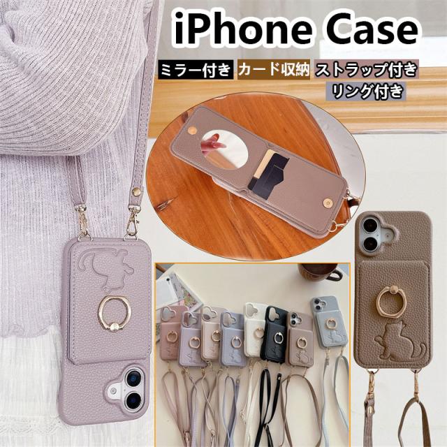 iphone13 pro ショルダーケース かわいい 猫 iPhone 13Pro 13ProMax 13ミニ ショルダー ストラップ スマホケース iPhone 16E 15 14 Plus 13 12Mini 11 SE2 携帯ケース リング スタンド 鏡 ミラー アイフォン13 12ミニ 7 8 ケース 耐衝撃 背面収納 ねこ ネコ 型押し 大人 韓国