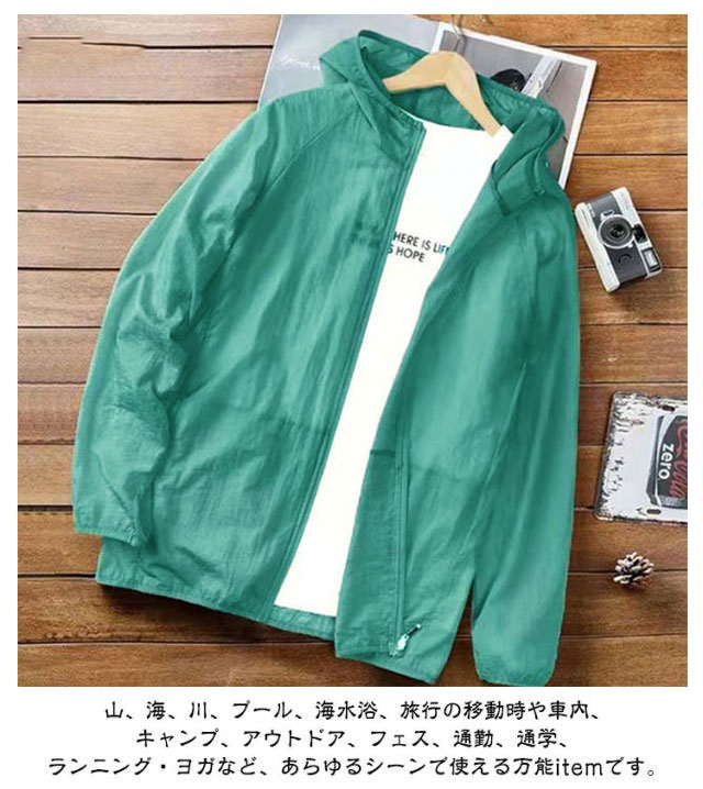 | しっかりUV対策できるラッシュガードパーカー。ウインドブレーカー 防風 UVカット 薄手でとっても軽い素材使い、コンパクトにたためて、旅行や持ち運びにも便利。 暑い夏もサラサラ接触冷感でひんやり冷感。 山、海、川、プール、海水浴、旅行の移動時や車内、キャンプ、アウトドア、フェス、通勤、通学、ランニング・ヨガなど、あらゆるシーンで使える万能itemです。 | |