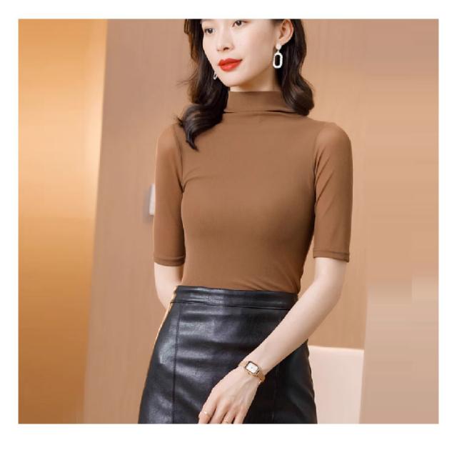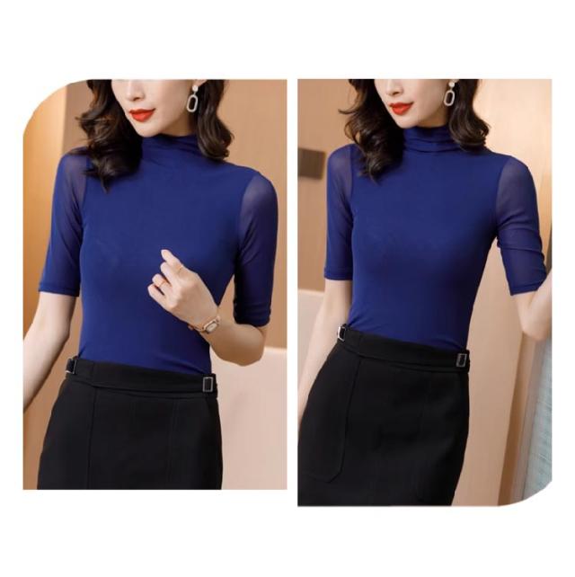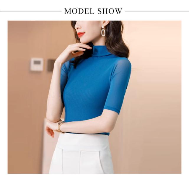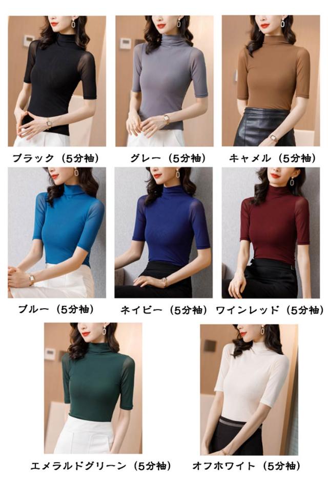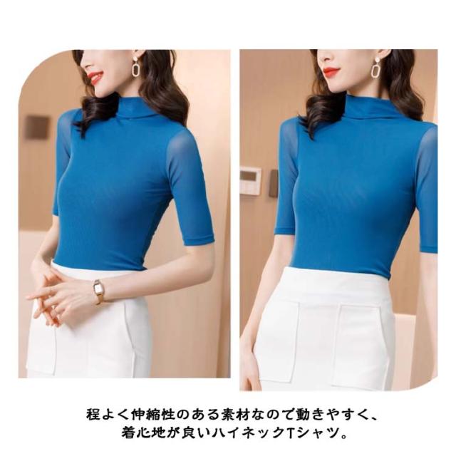 ハイネック 半袖 五部袖 タートルネック メッシュ Tシャツ 透け感 タイト インナー カットソー トップス スリム レイヤード 重ね着 ハイネックtシャツ ストレッチ 春夏 送料無料