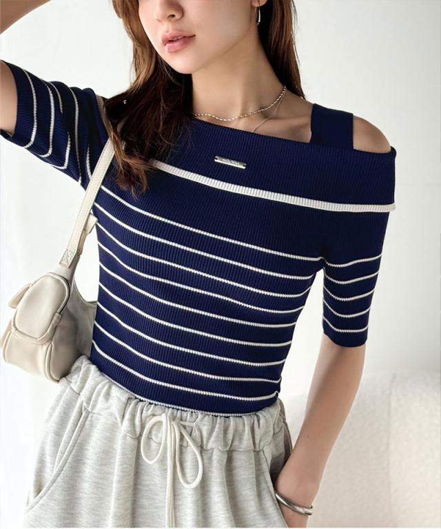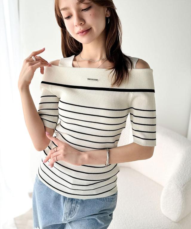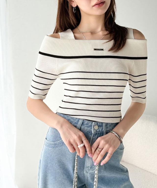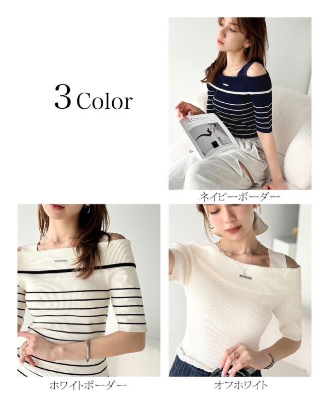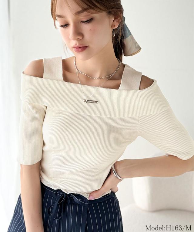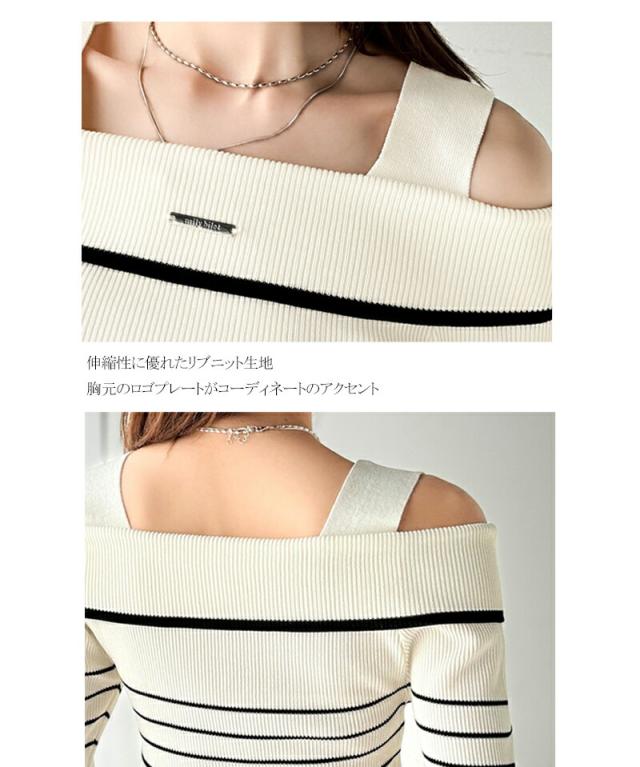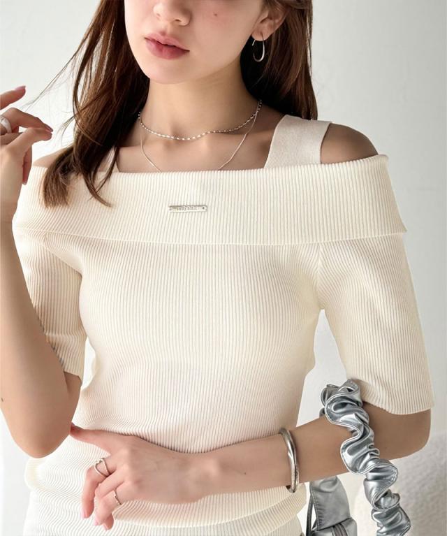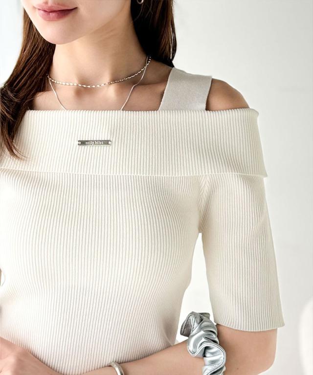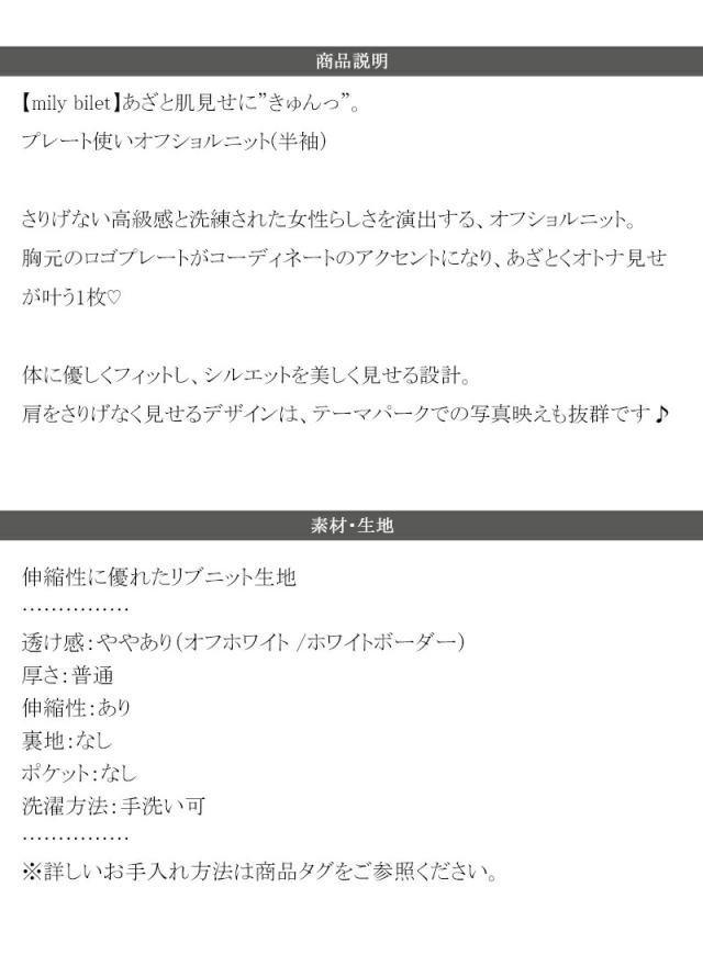 クラシカルエルフ秋新作 mily bilet トップス ニット レディース ブランド ロゴプレート使い オフショルダー リブニット 半袖 二の腕カバー 着回し 大きいサイズ 2025ss mi1029129