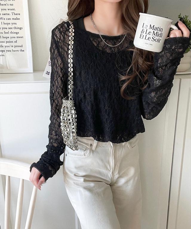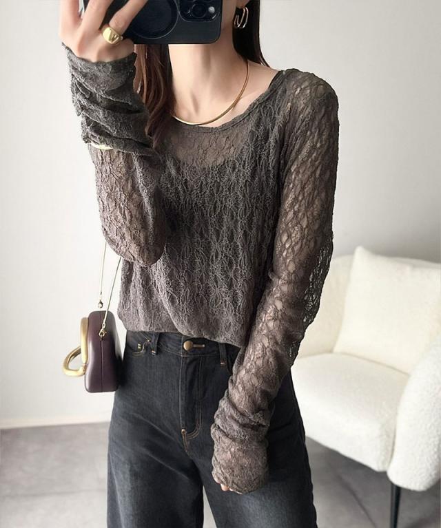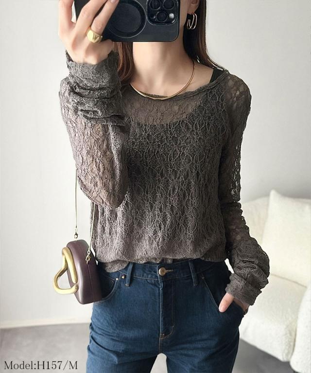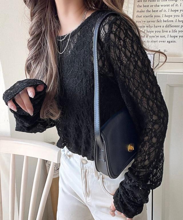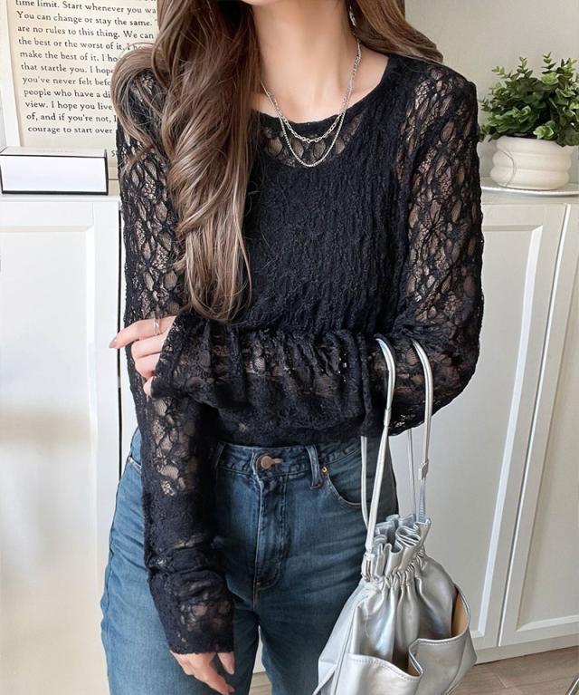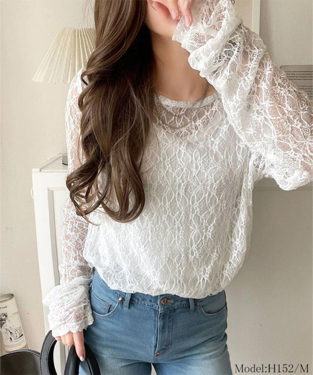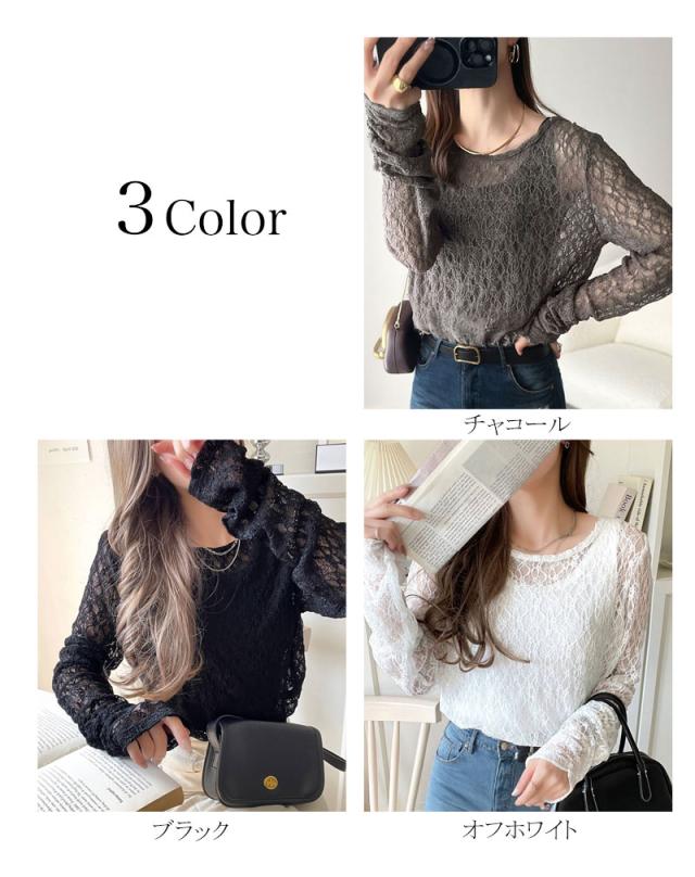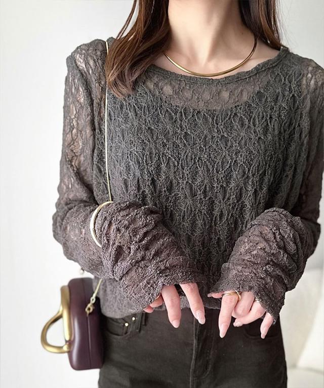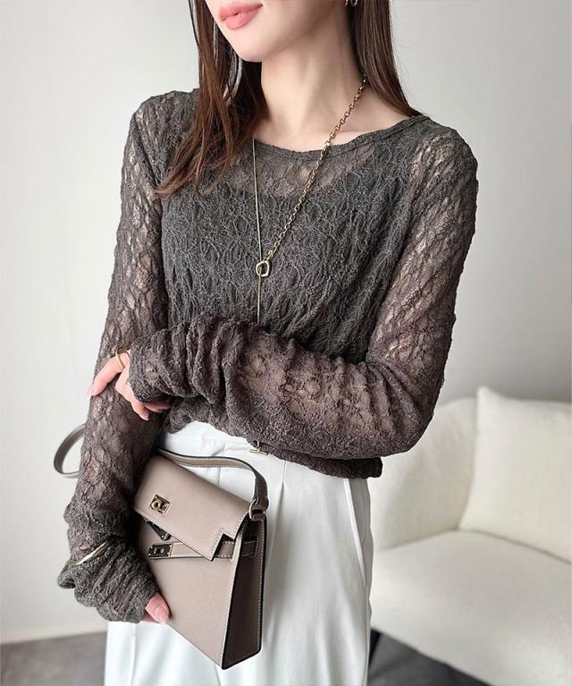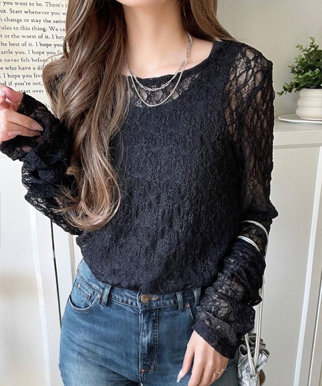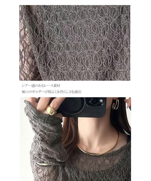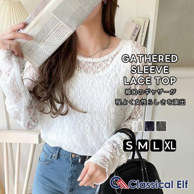 クラシカルエルフ秋新作 トップス Tシャツ レディース 袖ギャザー レース シアー 素材 プルオーバー 長袖 伸縮性 インナー レイヤードコーデ ロングシーズン 着回し 大きいサイズ 2025ss ce1010452