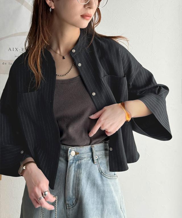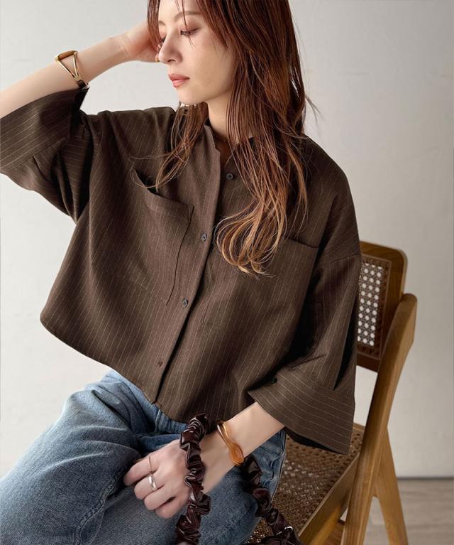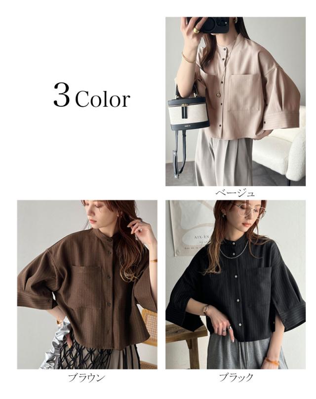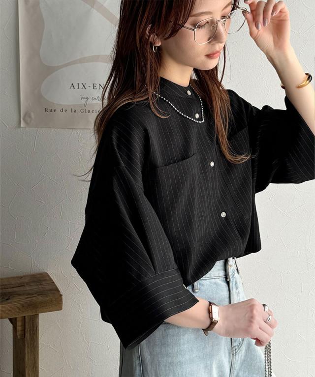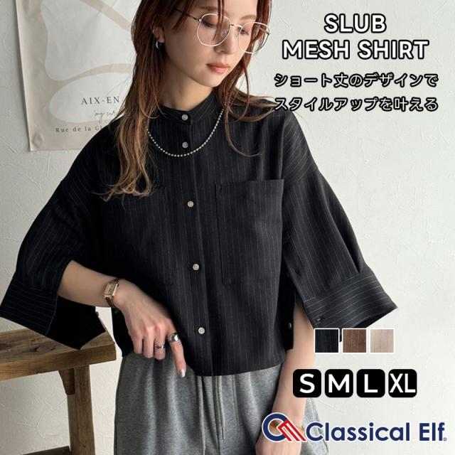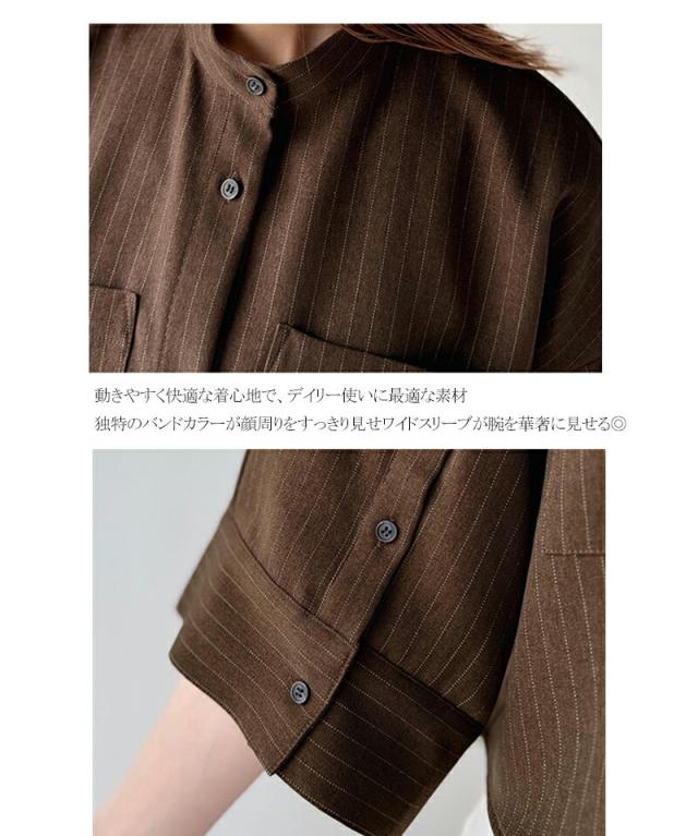 クラシカルエルフ春新作 トップス シャツ レディース バンド カラー ワイド スリーブ ショート 丈 ストライプ ブラウス 半袖 羽織り レイヤードコーデ 二の腕カバー 大きいサイズ 2026ss ce1110120