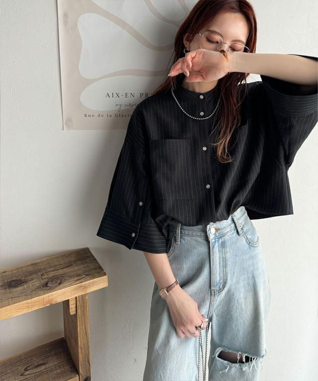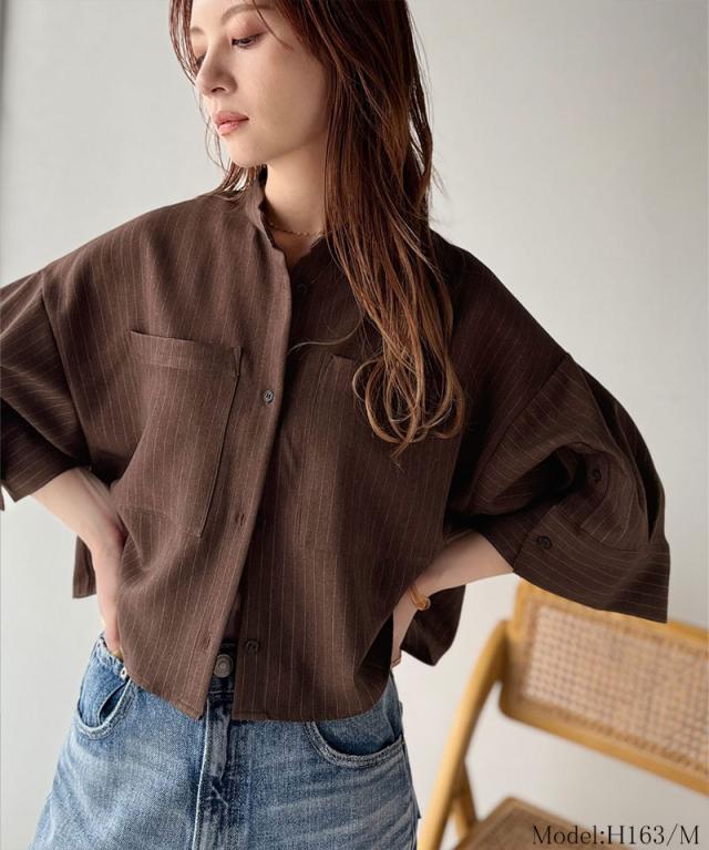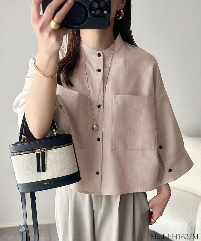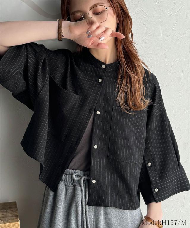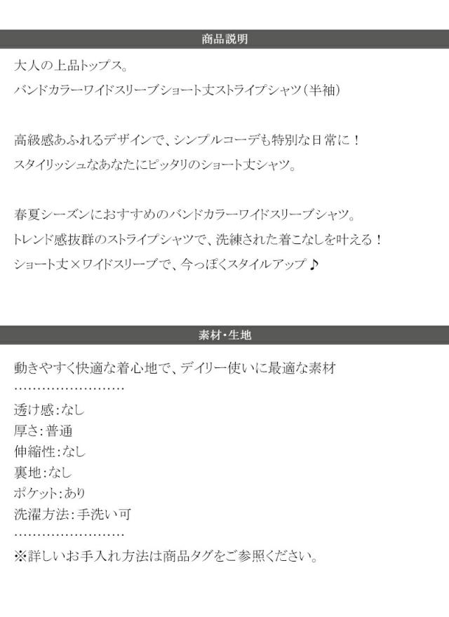 ★大人の上品トップス。バンドカラーワイドスリーブショート丈ストライプシャツ(半袖)★