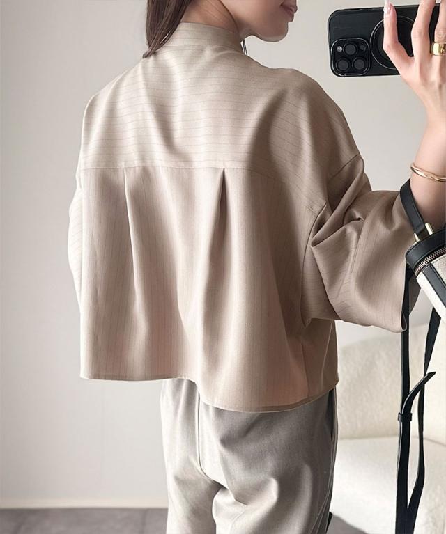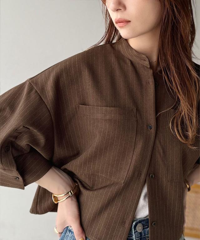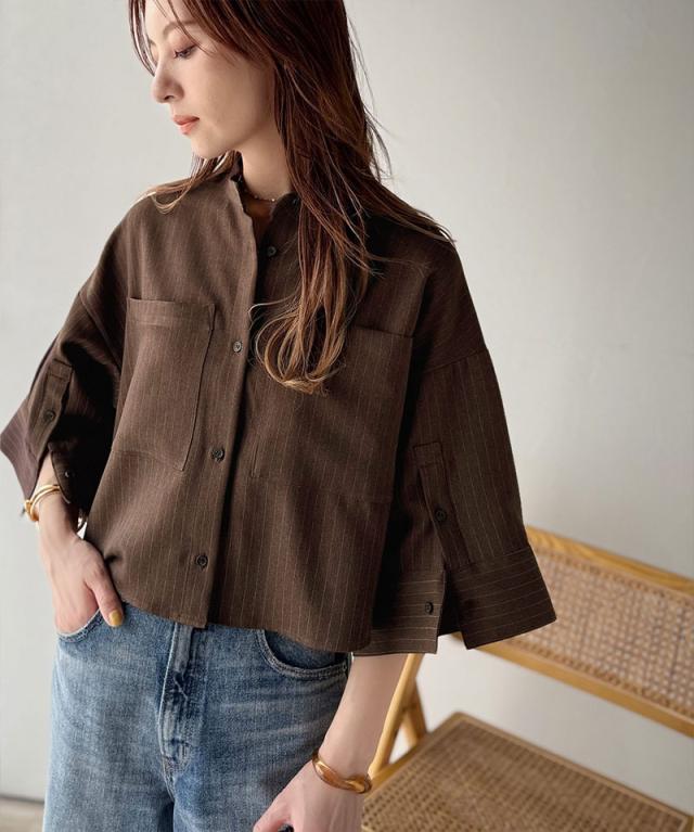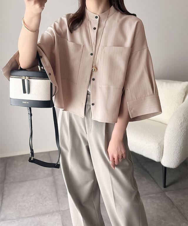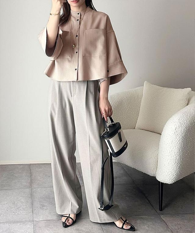 春夏シーズンにおすすめのバンドカラーワイドスリーブシャツ。
