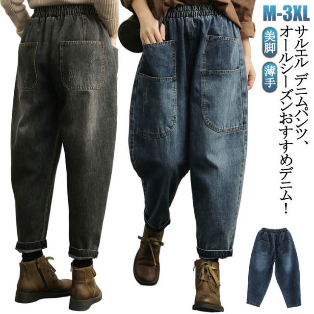 コクーンコクーン 美脚 ジーンズ デニム サルエル レディース デニムパンツ ボトムス ゆったり 大きいサイズ パンツ ワイドパンツ ウエストゴム デニムサルエルパンツ 薄手 サルエルパンツ ロング丈 美脚 森ガール 個性派