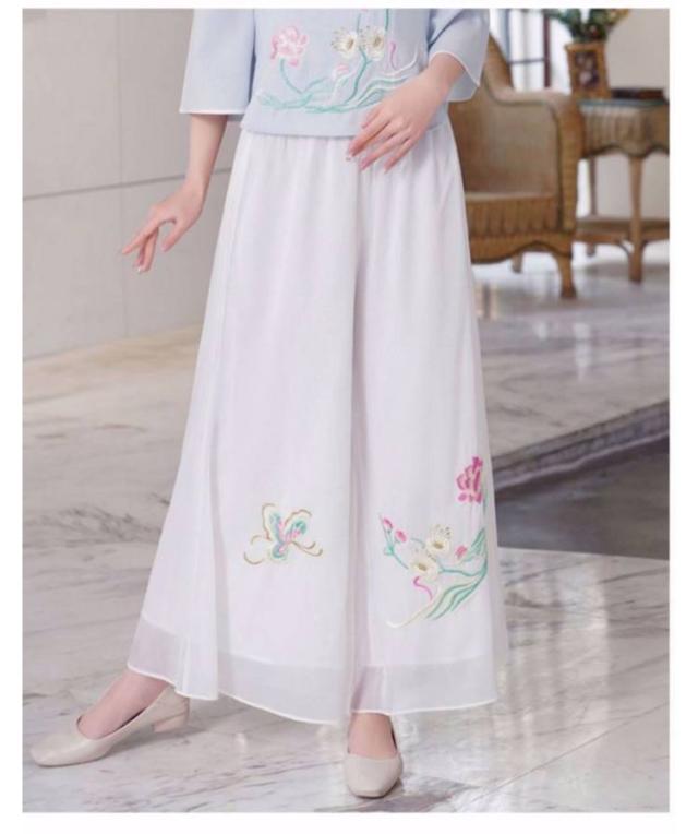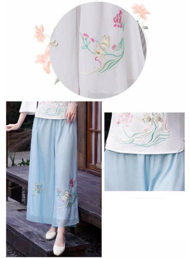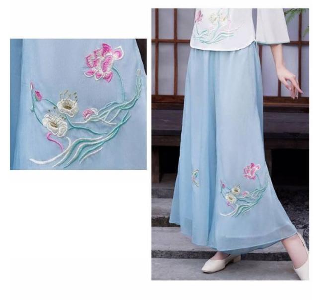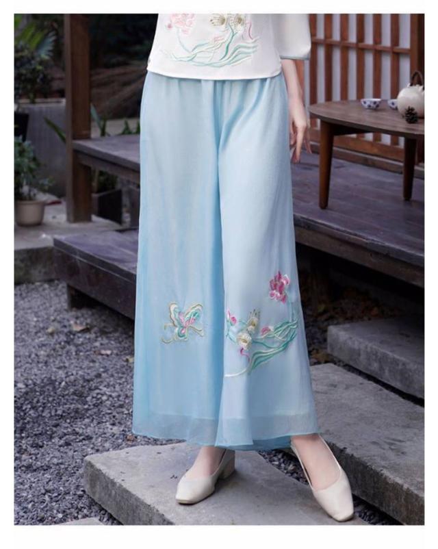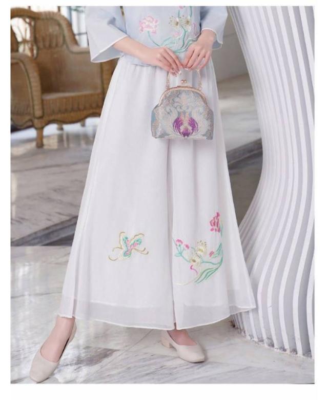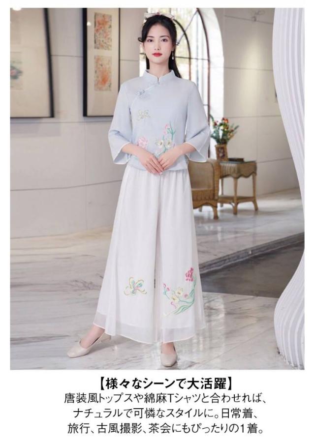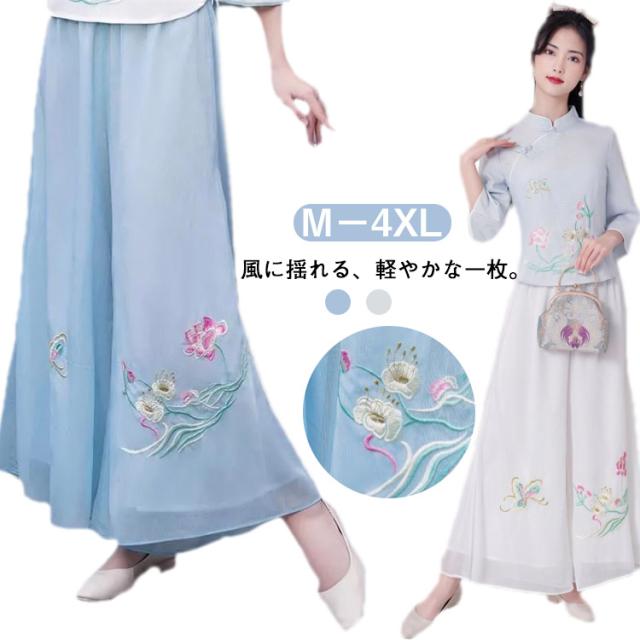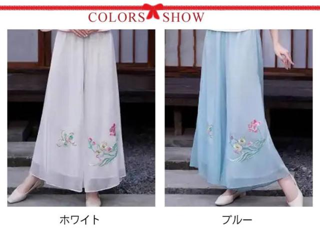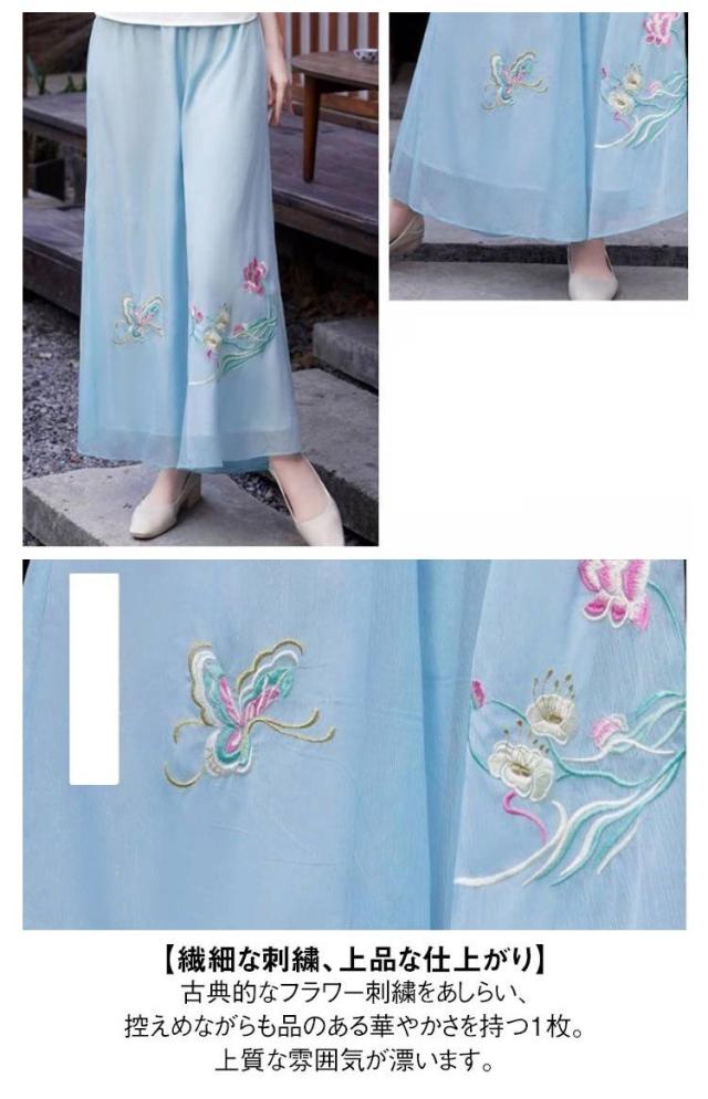 刺繍ワイドパンツ シフォン スカンツ 刺繍パンツ 春夏 二重 レイヤードパンツ ゆったり ガウチョパンツ 刺繍 ワイドパンツ チャイナ風 ボトムス ゆったり 花柄 旅行 おしゃれ 刺繍ワイドパンツ 撮影