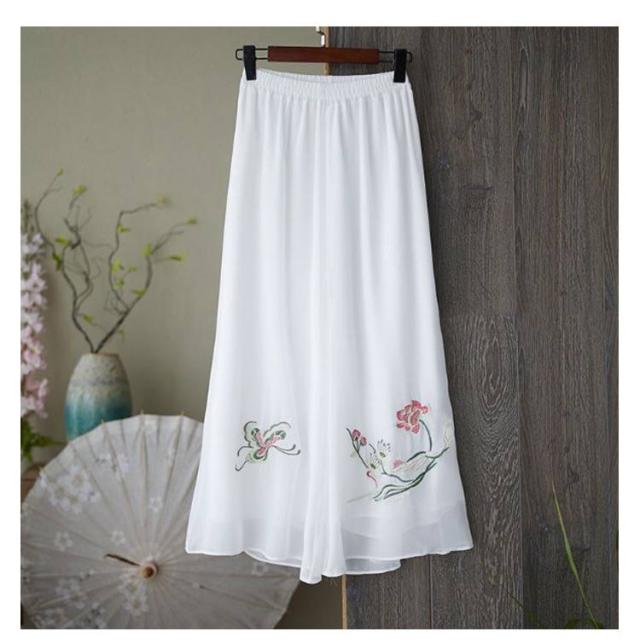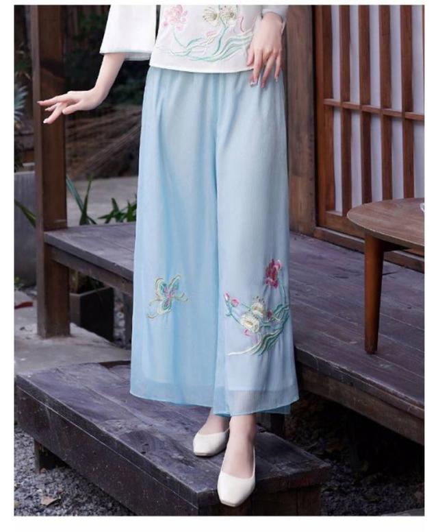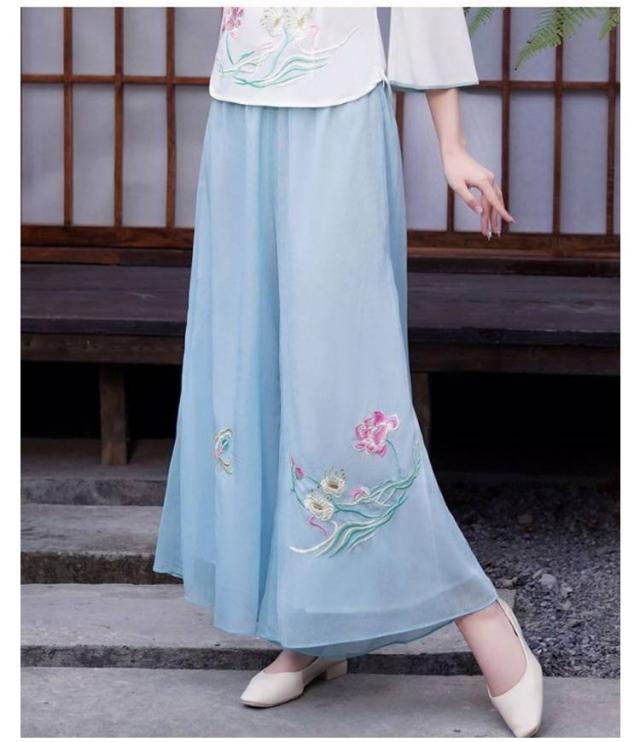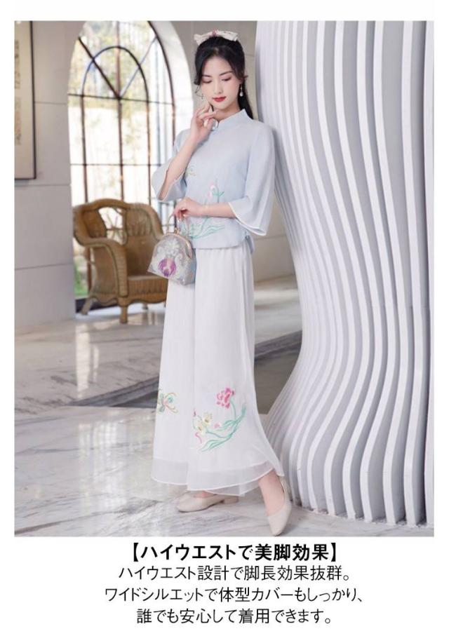 刺繍ワイドパンツ ガウチョパンツ 春夏 ワイドパンツ 唐装風 二重 ゆったり ゆったり 刺繍パンツ シフォン レイヤードパンツ チャイナ風 ボトムス 刺繍ワイドパンツ 花柄 刺繍 おしゃれ 旅行 撮影