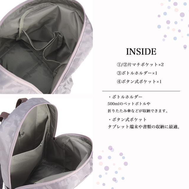 内側:ボタン式ポケット×1/片マチポケット×2/ベタ付けポケット×1/ボトルホルダー×1