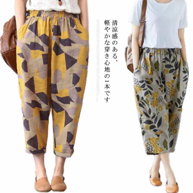 送料無料 レディース リネンパンツ テーパードパンツ カジュアルパンツ サルエルパンツ クロップドパンツ 棉麻 7分丈 花柄 水玉 ドット ウェストゴム ゆったり 体型カバー ワイドパンツ リラックス 大きいサイズ ナチュラル ワイドパンツ