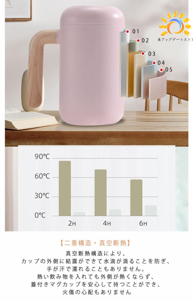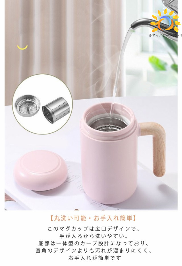 | 【高品質素材】内壁に施された耐久性の高いセラミックコーティングにより、金属成分が出にくく、飲み物本来の美味しさを楽しむ!外側はスタイリッシュなステンレスが施されており、傷や剥がれ、色あせに強く、高い耐久性を誇ります。 【二重構造・真空断熱】真空断熱構造により、カップの外側に結露ができて水滴が滴ることを防ぎ、手が汗で濡れることもありません。熱い飲み物を入れても外側が熱くならず、蓋付きマグカップを安心して持つことができ、火傷の心配もありません。 【丸洗い可能・お手入れ簡単】このマグカップは広口デザインで、手が入るから洗いやすい。底部は一体型のカーブ設計になっており、直角のデザインよりも汚れが溜まりにくく、お手入れが簡単です。 【茶こし付き】茶こしは耐熱性に優れ、錆びにくいステンレス素材が使用されています。 【握りやすい・フタ付き】人間工学に基づいた取っ手が付いており、大容量の飲み物を入れても持ちやすい形状です。飲み口にはフタが付いており、マグカップ内の温度を長時間保つだけでなく、ほこりや虫の侵入も防ぎ、安心して使用できます。 【軽量・コンパクト】家庭やオフィスでの日常使いはもちろん、キャンプや旅行など、さまざまなシーンで活躍します。 | |