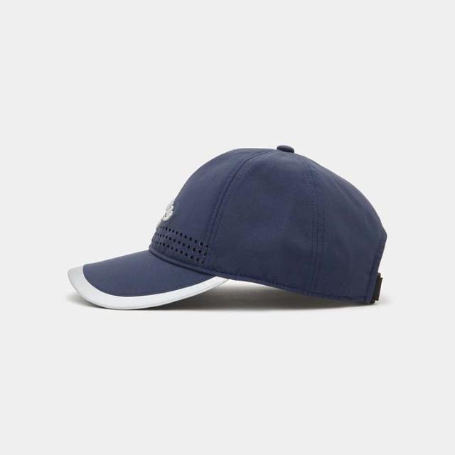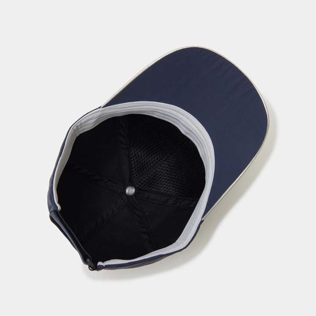 フロントにシルバーのロゴ刺繍とパンチングを施したスポーティーなキャップ。前パネルには柔らかい芯を採用し、長時間着用しても疲れにくい仕様に仕上げています。バックはベルクロ仕様となっているので誰でも簡単に微調節が可能な快適な被り心地が得られます。
