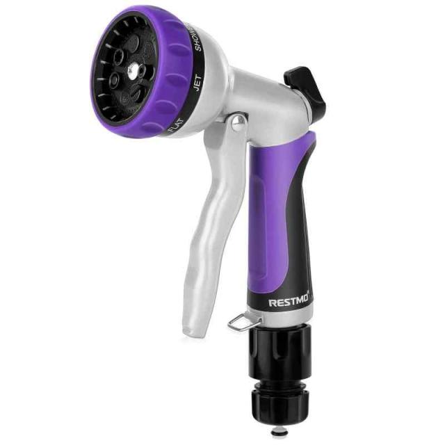RESTMO 普通ホース 散水ノズル 頑丈 金属ノズル 高圧 流量調節付 7パターン切替 植物や芝生の水やり、洗車やペット用 (パープル)