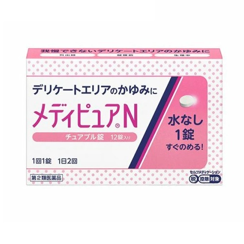 メディピュアNは、デリケートエリアのかゆみを飲んで治すお薬です。外出中など対処しにくい状況でも、水なしですぐに飲めるピーチミント味のチュアブル錠です。