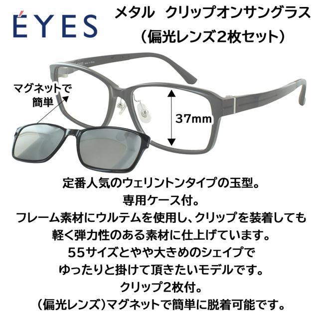 | 商品詳細 EYES アイイエス メガネ フレーム マグネット式クリップ サングラス 偏光レンズ2枚付き メンズ 男性向けモデル 定番人気のウェリントンタイプのメガネフレーム フレーム素材にウルテム素材を使用し、マグネット式のクリップサングラスを装着しても、軽く弾力性のある素材に仕上げています 調整可能な鼻パッドを採用 耳掛け部分も芯入りで調整が可能です クリップサングラスはマグネット式で簡単に着脱可能です こちらの商品はダミーレンズの状態での販売となります ※ダミーレンズはUVカットがされていないレンズとなります 伊達メガネ用、UVカット付きの度なしレンズ 1.56レンズは+1100円にて交換対応します。 度付きレンズをご希望の場合は、別途料金がかかりますので、予めご了承ください。 | |