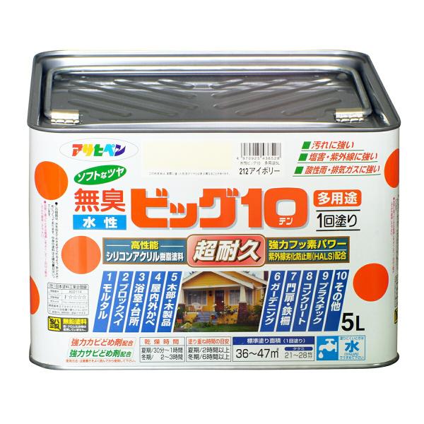 塗料 水性ビッグ10 多用途 5L アイボリー アサヒペン 水性塗料 ペンキ 水性 水性ペンキ 錆止め塗料 超耐久 防カビ 防さび 無臭 多用途 劣化防止