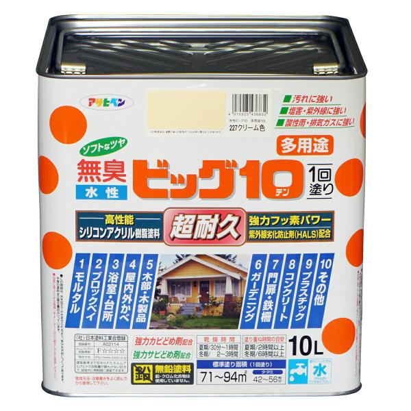 塗料 水性ビッグ10 多用途 10L クリーム色 アサヒペン 水性塗料 ペンキ 水性 水性ペンキ 錆止め塗料 超耐久 防カビ 防さび 無臭 多用途 劣化防止