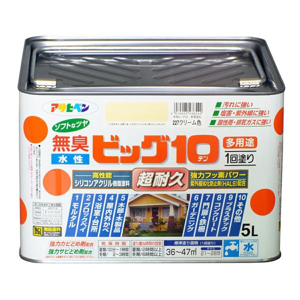 塗料 水性ビッグ10 多用途 5L クリーム色 アサヒペン 水性塗料 ペンキ 水性 水性ペンキ 錆止め塗料 超耐久 防カビ 防さび 無臭 多用途 劣化防止