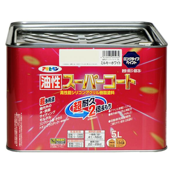 塗料 油性スーパーコート 5L ミルキーホワイト アサヒペン ペンキ 油性 油性塗料 錆止め塗料 錆止め 屋根塗料 トタン屋根用塗料 コンクリート塗料 多用途
