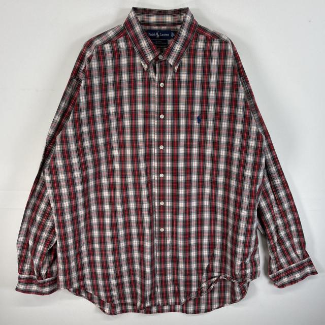 古着 90s/90年代 ラルフローレン RALPH LAUREN 長袖シャツ ボタンダウンシャツ ロゴ 刺繍 チェック XL レッド系 マルチカラー メンズ