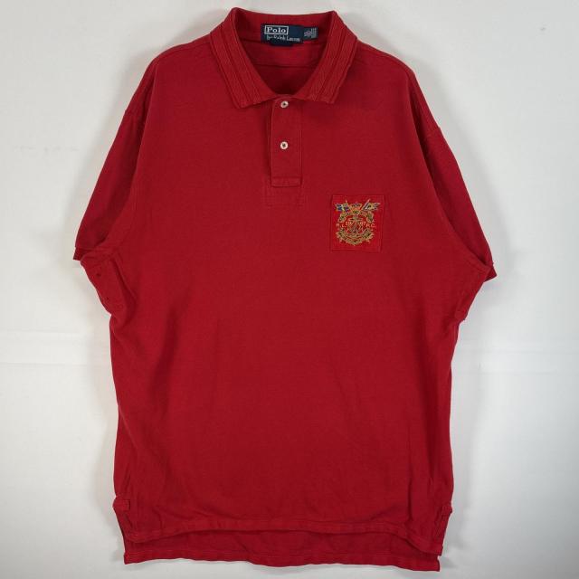 古着 90s/90年代 ポロバイラルフローレン Polo by Ralph Lauren 鹿の子 半袖 ポロシャツ ワッペン 2ボタン XL レッド 無地 メンズ