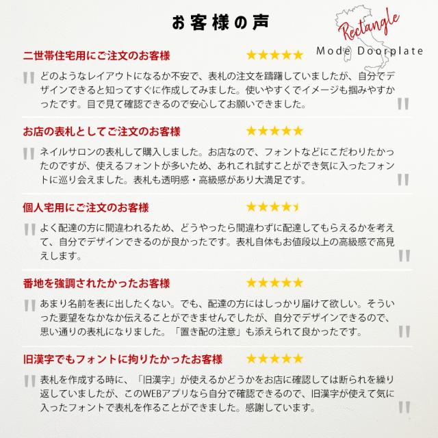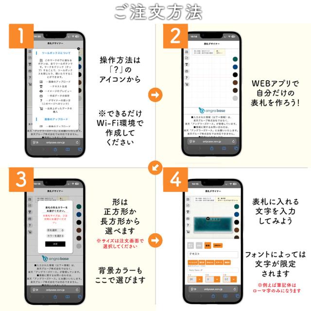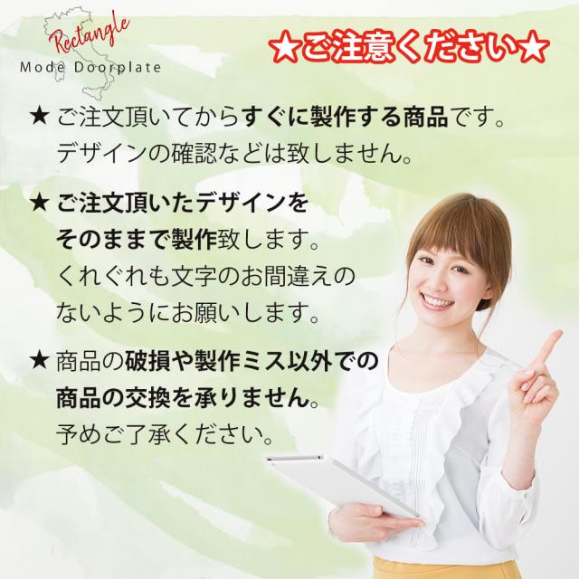 | よくある質問 | Q.何文字まで入りますか? A.WEBアプリにて、枠内に入れば、ご自由に何文字でも入れることが可能です。 Q.番地を入れることはできますか? A.もちろん可能です。全体のバランスを考慮し、ご自由にデザインしてください。 Q.二世帯用に製作することはできますか? A.もちろん可能です。全体のバランスを考慮し、ご自由にデザインしてください。 Q.表札文字の大きさは変更できますか? A.もちろん可能です。文字の縮小拡大ができるので、お好きな大きさでデザインしてください。 Q.表札のサイズを変更することはできますか? A.こちらの商品は、即出荷をする商品のためお受けすることができません。正方形が3種類、長方形が3種類のみとなります。 |