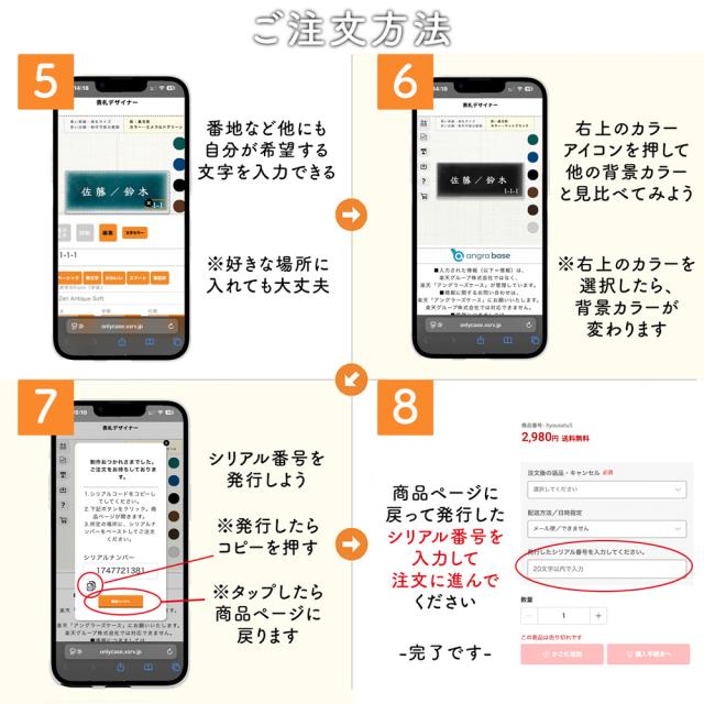 | 注意事項 | ☆ご注文頂いてからすぐに製作する商品です。デザインの確認の連絡などは致しません。 ☆ご注文頂いたシリアル番号のデータをそのままで製作致します。シリアル番号が認識できない場合や、画像が当店に入って無かった場合は、メールにて連絡いたします。できるだけ早めにご返信下さいませ。 ☆WEBアプリで作った情報と、注文時に選択した情報が違う場合は、注文情報を元に制作いたします(例 WEBアプリでは正方形の金箔になっていたのに、注文の選択肢ではサイズが130mm×52センチになっていたり、銀箔を選択されていた場合は、130mm×52センチの銀箔で制作いたします)。 ☆完全オリジナル商品となるため、制作後のキャンセル・返品・交換ができませんので、予めご了承くださいませ。制作は基本的に翌営業日に致します。 ☆エメラルドグリーンとサファイヤブルーの背景カラーは、届いた後に間違っているという連絡を頂くことがあります。人間の目は個人差があり、特に緑と青の感じ方にはかなりの差が出ます。基本的に当店では互いのカラーに間違いが無いように生産しておりますので、届いたカラーに間違いは無いものとお考えください。 ☆商品の到着後の注意事項 ◎(除菌シートなど)アルコールで拭くのは厳禁です。アクリルはアルコールを吸うと割れる可能性が高くなります。また、文字の箔部分もアルコールで拭いたり、爪など尖った物で削ったり、研磨剤などを使用することはお控え下さい。箔が取れる原因になります。表面が汚れた場合は、少し水で湿らせた布や雑巾などで拭き取って下さい。また、稀に箔が剥がれたという連絡を頂きますが、アルコールで拭いたり鋭利な物で触らない限り、剥がれることはあり得ません。こちらは第三者による被害の可能性もありますので、基本的には補償はいたしません。補償は届いた時点での不備によるものとなりますので、予めご了承くださいませ。 |