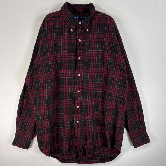 古着 90s/90年代 ラルフローレン RALPH LAUREN 長袖シャツ チェック柄 ロゴ 刺繍 ボタンダウン M ワインレッド系 マルチカラー メンズ