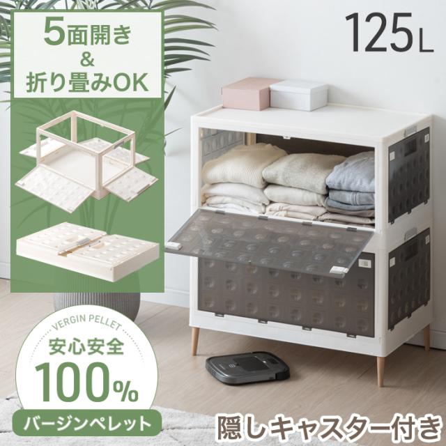 収納ケース プラスチック 5面開き 大容量 折りたたみ 収納ボックス 積み重ね 木脚 キャスター 前開き 5面開閉 半透明 中が見えない 押し入れ クローゼット 2段 125L