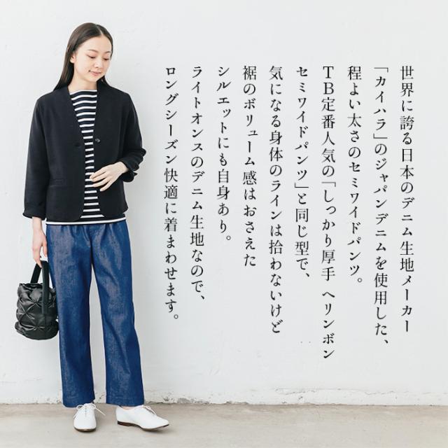 特徴 探していた、ちょうどよいワイド。世界に誇る日本のデニム生地メーカー「カイハラ」のジャパンデニムを使用した、程よい太さのセミワイドパンツ。TB定番人気の「しっかり厚手 ヘリンボンセミワイドパンツ」と同じ型で、気になる身体のラインは拾わないけど裾のボリューム感はおさえたシルエットにも自身あり。ライトオンスのデニム生地なので、ロングシーズン快適に着まわせます。