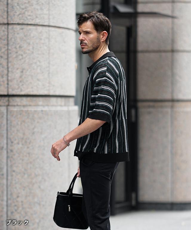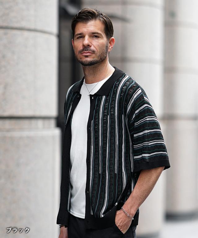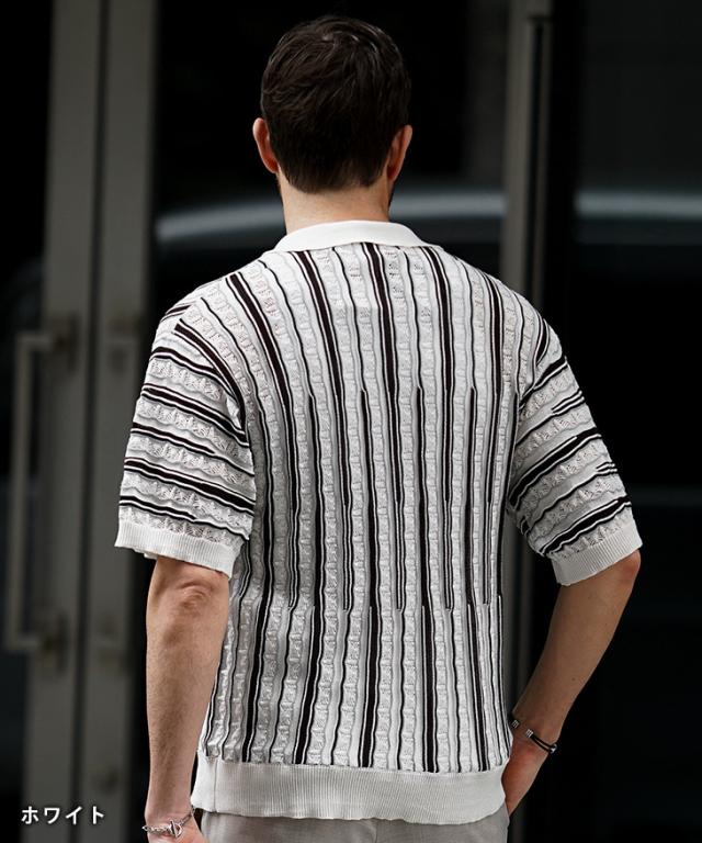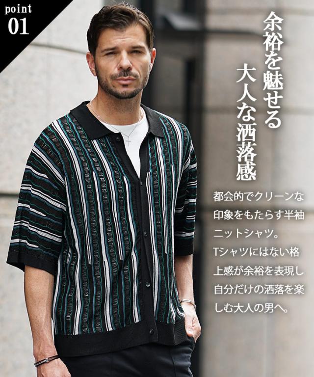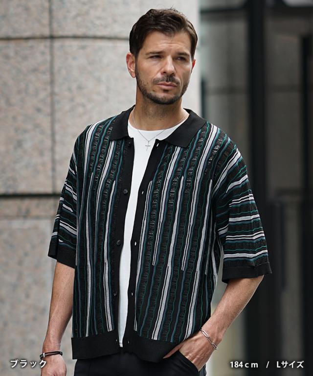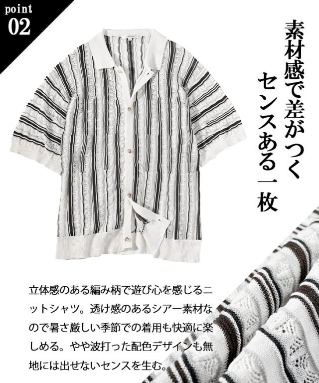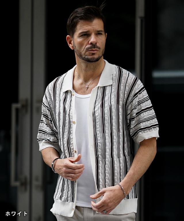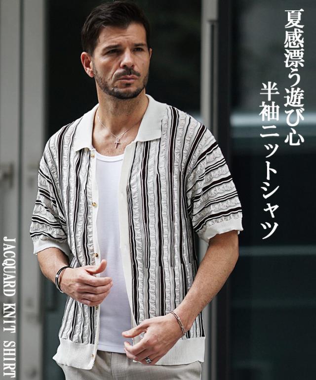 半袖シャツ メンズ ニットシャツ ストライプ シャツ メンズ 半袖 ニット サマーニット 春 夏 新作 シアーシャツ オラオラ系 お兄系 イケオジ メンズファッション ジャガード