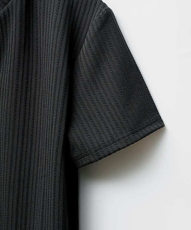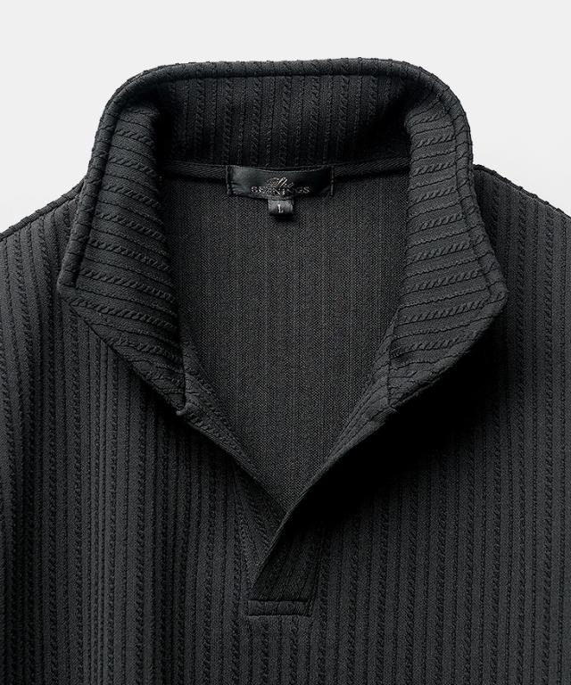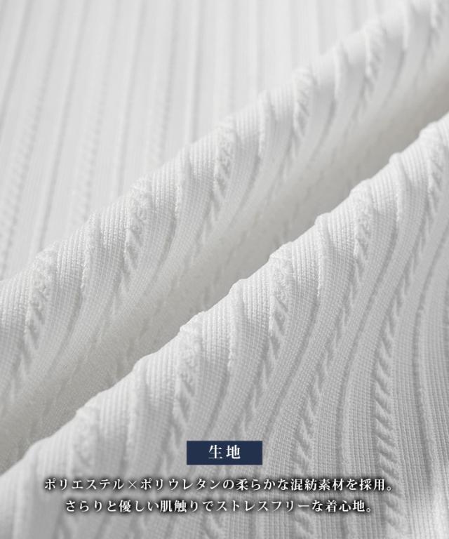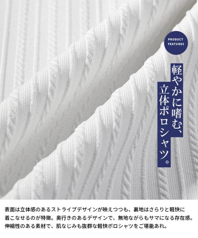 しなやかな色気を快適に纏う『ロープストライプ半袖ポロシャツ』【ロープストライプイタリアンカラー半袖ポロシャツ】■Design/デザインこの春夏、洗練された大人の余裕をまといたいなら、この一枚を選ぶべき。スキッパー仕様のイタリアンカラーが生み出すのは、ただのキレイめでは終わらない色気と立体感。ワイヤー入りの襟は自在に立ち上がり、どんな角度でも絵になるシルエットを演出。ロープストライプの繊細な表情が、上質な陰影を与え、視線を引き寄せる。ただのポロシャツじゃ物足りないなら、装いに自信を加える、春夏の最適解を選べ。■Material/素材感ポリエステルやポリウレタンを使用した薄手で伸縮性に富んだ生地が、動きやすさと快適さを両立。