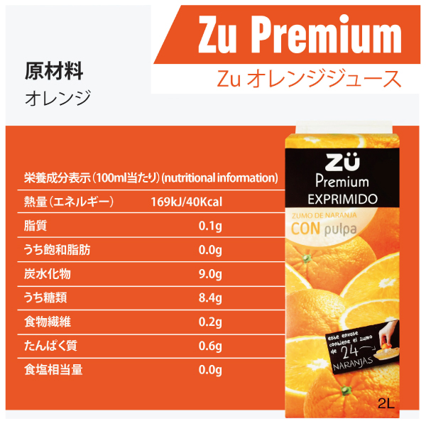 Zu Premium Exprimido オレンジジュースは「甘さと酸味のバランスがちょうどいい!」と、コストコで人気の商品。スペイン産のバレンシアオレンジストレートジュースは、手絞りしたような果肉感を得られて、贅沢な気分を味わうことができます。たっぷり2000ミリ入りです。6本入りのケース単位でお届けします。着色料、保存料、砂糖、香料不使用、濃縮還元ではなく新鮮な果物でつくられているので小さなお子様も安心してお飲みいただけます。1日に必要量の自然状態のビタミンC30%に相当します。 世界最大のヨーロッパのジュースメーカーが新鮮な果物から作って、保存料など不使用ですので、要冷蔵食品になっています。クール便でお届けします。