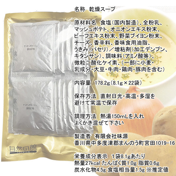 玉ねぎとポテトが絶妙に溶け合った、とろみ系スープ登場!名称 即席スープ(ポタージュ)原材料名食塩、全粉乳、マッシュポテト、オニオンエキスパウダー、砂糖、粉末油脂、デキストリン、オニオンパウダー、チキンエキスパウダー、酵母エキスパウダー、ビーフエキスパウダー、野菜ブイヨンパウダー、チーズ、香辛料、香味食用油脂、うきみ(パセリ)/増粘剤(加工デンプン、キサンタン)、調味料(アミノ酸等)、微粒二酸化ケイ素、(一部に小麦・乳成分・大豆・牛肉・鶏肉・豚肉を含む)内容量 8.1g×22賞味期限製造日より約365日保存方法 直射日光、高温・多湿を避けて常温で保存してください。製造者 有限会社 味源(美味しさは元気の源 自然の館)香川県仲多度郡まんのう町宮田1019-16 TEL0877-75-3181調理方法 150ccの熱湯で溶いてお召し上がりください。