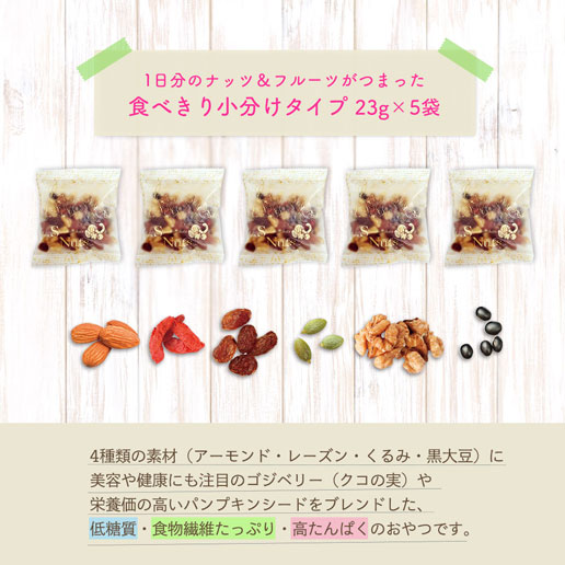 管理栄養士監修!月曜から金曜まで毎日続けられる、食べ切り小分けパックです!名称:菓子原材料:くるみ、サルタナレーズン、アーモンド、黒大豆、クコの実、かぼちゃの種、植物油内容量:230g(23gが5袋入り×2袋セット)賞味期限:製造日より約185日保存方法:直射日光、高温・多湿を避けて、常温で保存してください。販売者:有限会社 味源(美味しさは元気の源 自然の館)香川県仲多度郡まんのう町宮田1019番地16 TEL0877−75−3181ご注意:●開封後は賞味期限に関わらず、お早めに召し上がりください。また、個包装開封後は一度で食べ切ってください。●ミックス品のため内容物にばらつきが出る場合があります。●本品製造工場では、小麦、卵、乳成分、落花生を含む製品を製造しています。栄誉成分表示(1袋23gあたり):エネルギー119kcal、たんぱく質4.4g、脂質7.7g、炭水化物9.1g、糖質7.0g、食物繊維2.1g、食塩相当量0.02g、鉄0.9mg、ビタミンE1.4mgポリフェノール170mgお届け方法:ネコポス配送 代金引換不可・到着日指定不可