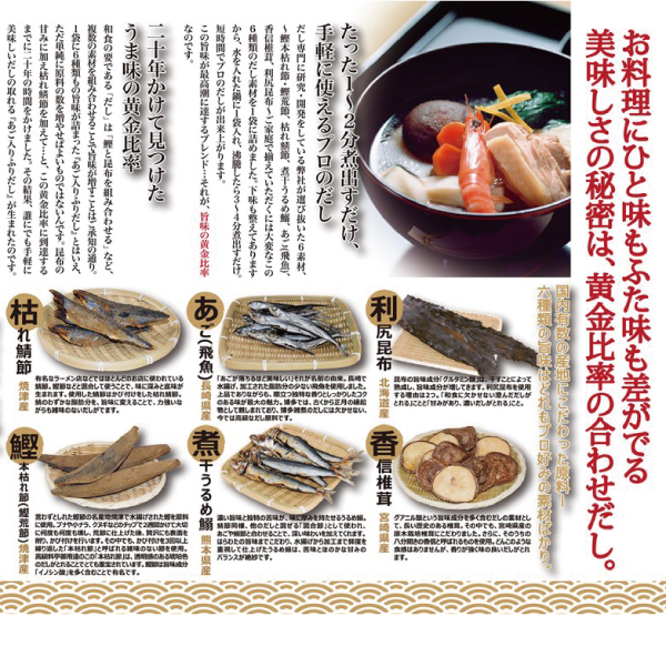 【鰹本枯れ節、荒節、鯖節、煮干うるめ鰯、長崎県産あご(飛魚)、宮崎県産香信椎茸、北海道産利尻昆布】を使用し、