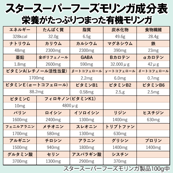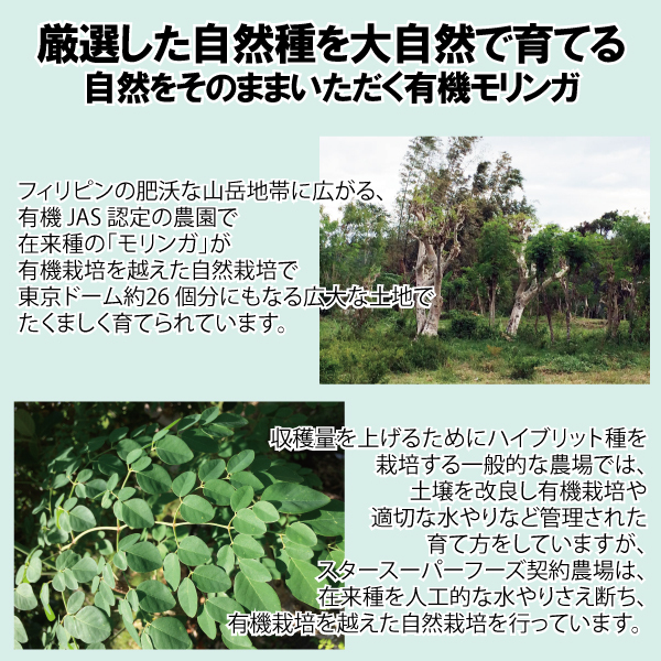 日本国内加工・添加物一切不使用モリンガの葉100%野生の自然種を厳選し、肥沃な山地で水肥料を与えない有機栽培を超えた完全100%自然栽培のモリンガを使用しています。