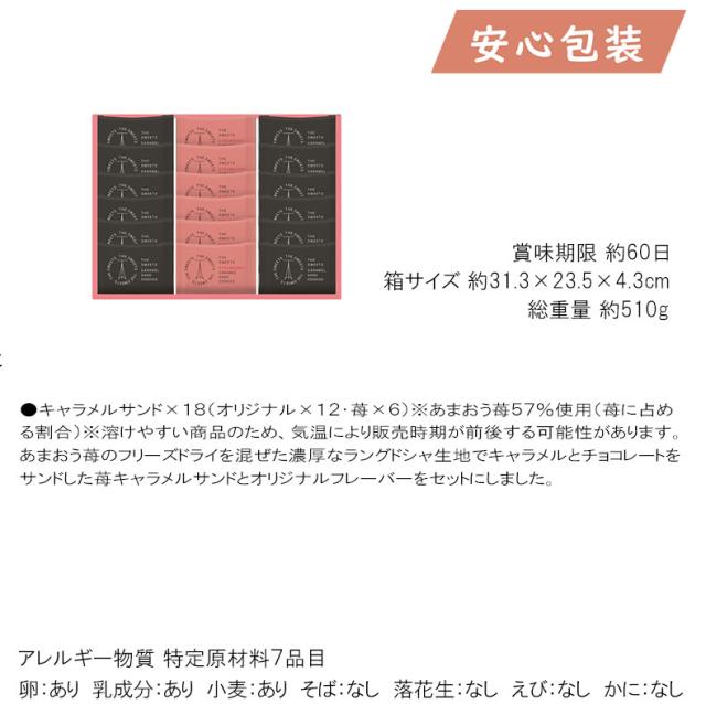』 ●キャラメルサンド×18(オリジナル×12・苺×6)※あまおう苺57%使用(苺に占める割合)※溶けやすい商品のため、気温により販売時期が前後する可能性があります。 あまおう苺のフリーズドライを混ぜた濃厚なラングドシャ生地でキャラメルとチョコレートをサンドした苺キャラメルサンドとオリジナルフレーバーをセットにしました。 箱サイズ 約31.3×23.5×4.3cm 総重量 約510g 賞味期限 約60日 アレルギー物質 特定原材料7品目 卵:あり 乳成分:あり 小麦:あり そば:なし 落花生:なし えび:なし かに:なし ■さまざまなギフトアイテムをご用意しております。 お気軽にお問い合わせください。 内祝 内祝い お祝い返し ウェディングギフト ブライダルギフト 引き出物 引出物 結婚引き出物 結婚引出物 結婚内祝い 出産内祝い 命名内祝い 入園内祝い 入学内祝い 卒園内祝い 卒業内祝い 就職内祝い 新築内祝い 引越し内祝い 快気内祝い 開店内祝い 二次会 披露宴 お祝い 御祝 結婚式 結婚祝い 出産祝い 初節句 七五三 入園祝い 入学祝い 卒園祝い 卒業祝い 成人式 就職祝い 昇進祝い 新築祝い 上棟祝い 引っ越し祝い 引越し祝い 開店祝い 退職祝い 快気祝い 全快祝い 初老祝い 還暦祝い 古稀祝い 喜寿祝い 傘寿祝い 米寿祝い 卒寿祝い 白寿祝い 長寿祝い 金婚式 銀婚式 ダイヤモンド婚式 結婚記念日 ギフト ギフトセット セット 詰め合わせ 贈答品 お返し お礼 御礼 ごあいさつ ご挨拶 御挨拶 プレゼント お見舞い お見舞御礼 お餞別 引越し 引越しご挨拶 記念日 誕生日 父の日 母の日 敬老の日 記念品 卒業記念品 定年退職記念品 ゴルフコンペ コンペ景品 景品 賞品 粗品 お香典返し 香典返し 志 満中陰志 弔事 会葬御礼 法要 法要引き出物 法要引出物 法事 法事引き出物 法事引出物 忌明け 四十九日 七七日忌明け志 一周忌 三回忌 回忌法要 偲び草 粗供養 初盆 供物 お供え お中元 御中元 お歳暮 御歳暮 お年賀 御年賀 残暑見舞い 年始挨拶 話題 のし無料 メッセージカード無料 ラッピング無料 手提げ袋無料 大量注文
