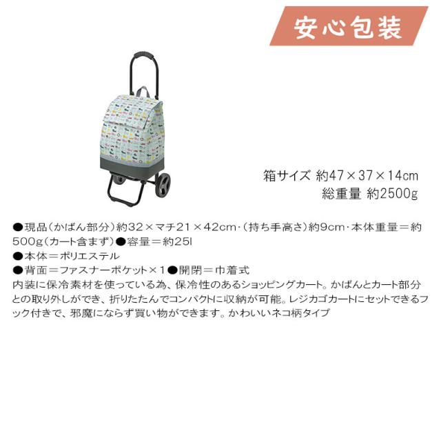 内装に保冷素材を使っている為、保冷性のあるショッピングカート。かばんとカート部分との取り外しができ、折りたたんでコンパクトに収納が可能。レジカゴカートにセットできるフック付きで、邪魔にならず買い物ができます。かわいいネコ柄タイプ