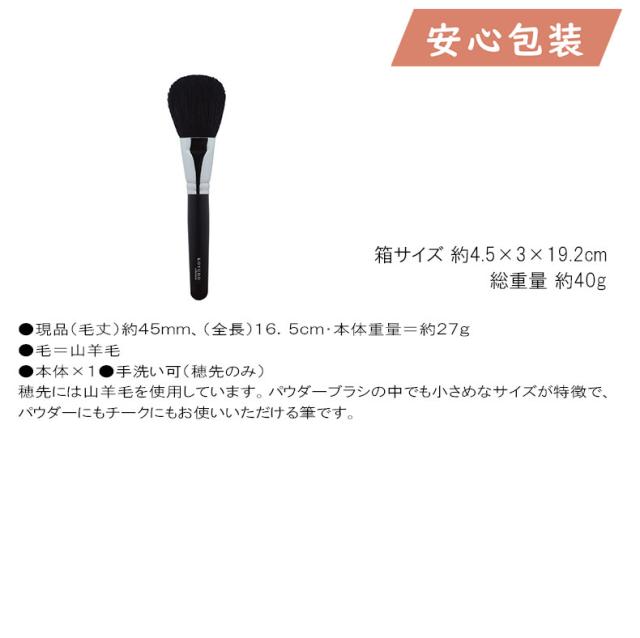 穂先には山羊毛を使用しています。パウダーブラシの中でも小さめなサイズが特徴で、パウダーにもチークにもお使いいただける筆です。