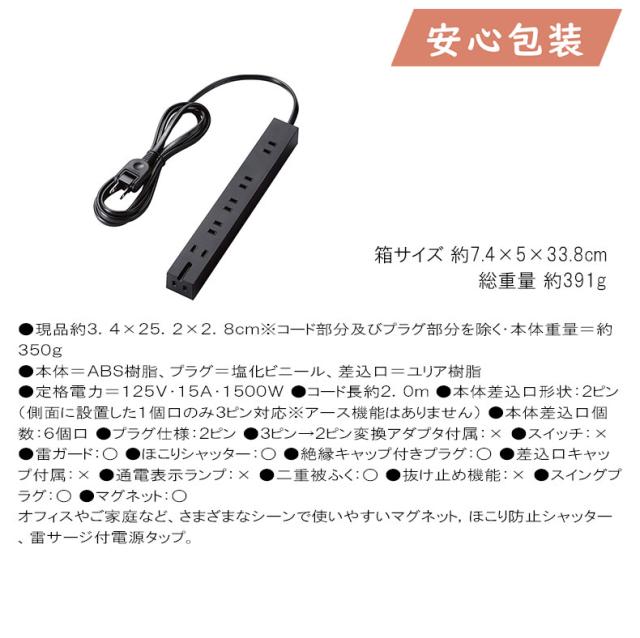 ●定格電力=125V・15A・1500W ●コード長約2.0m ●本体差込口形状:2ピン(側面に設置した1個口のみ3ピン対応※アース機能はありません) ●本体差込口個数:6個口 ●プラグ仕様:2ピン ●3ピン→2ピン変換アダプタ付属:× ●スイッチ:× ●雷ガード:○ ●ほこりシャッター:○ ●絶縁キャップ付きプラグ:○ ●差込口キャップ付属:× ●通電表示ランプ:× ●二重被ふく:○ ●抜け止め機能:× ●スイングプラグ:○ ●マグネット:○